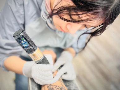 Jaylyn Lay specializes in Anime Blackwork Stippling, combining technical precision with a relaxed, welcoming atmosphere.